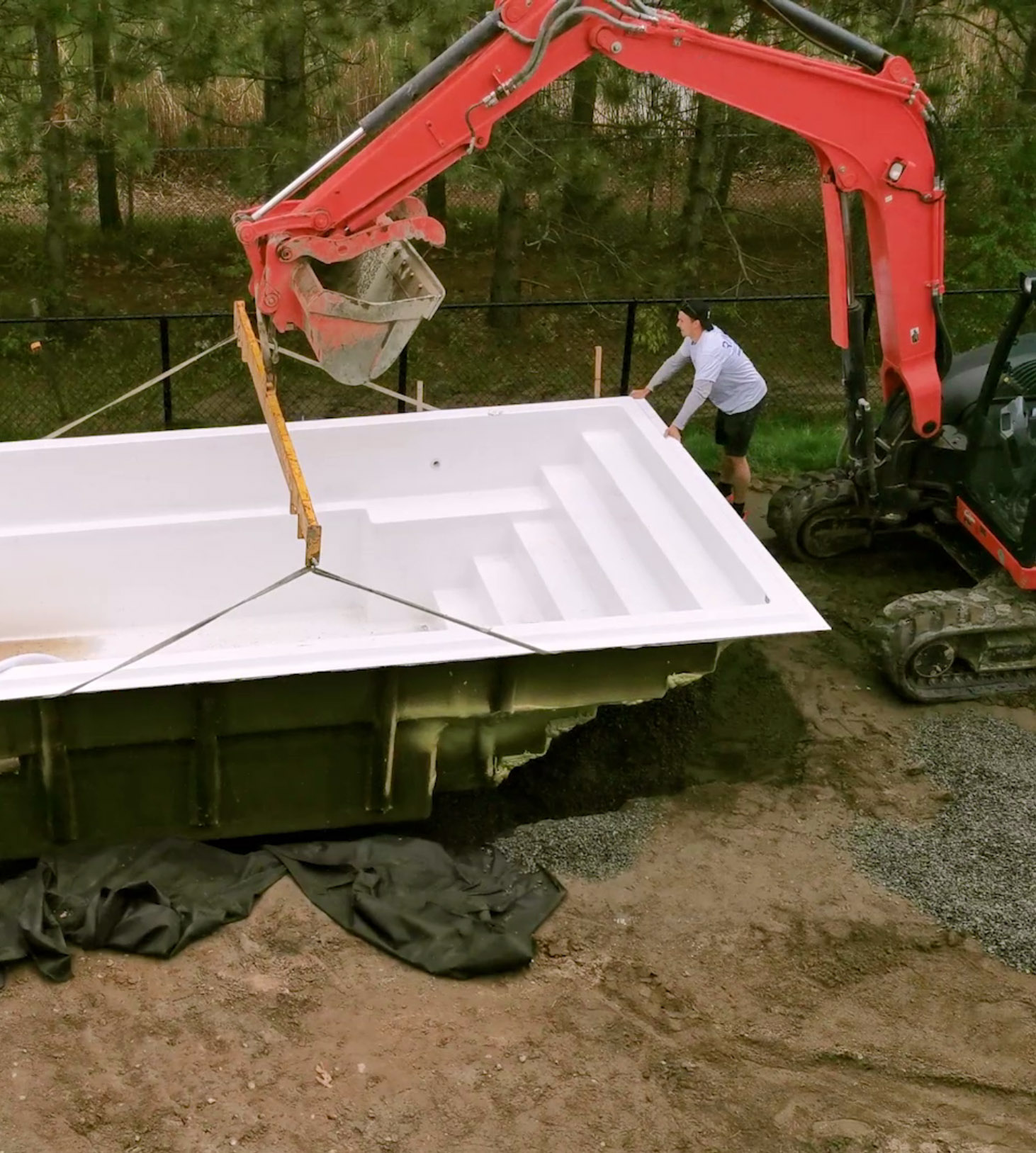 A fiberglass pool is a one-piece shell that is dropped into the ground. Installation takes less time than other pool types. There are not any individual wall sections, vinyl liners or plaster finishes. These materials are very time consuming to add and can slow down the building process due to bad weather conditions.